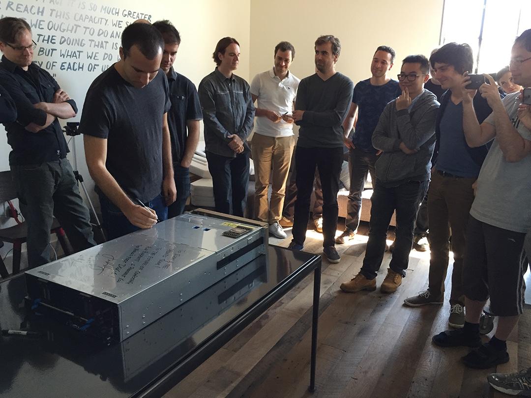 OpenAI 的研究人员开箱人工智慧超级电脑 NVIDIA DGX-1。