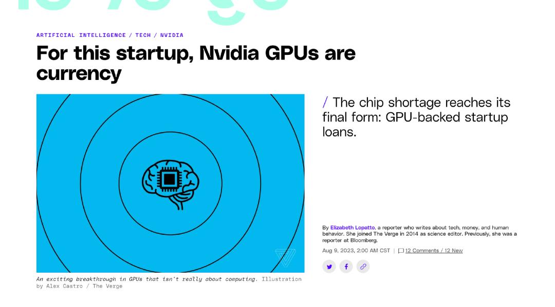 《对这家创业公司而言,英伟达 GPU 就是货币》2023.08.09 The Verge 报道标题。