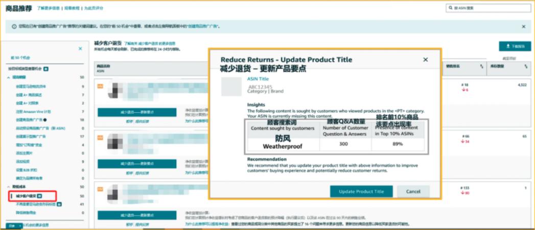 除了这个好消息,亚马逊后台的AI工具“增长机会”进行了升级,增加了“推荐关键词”“降低退货率”等功能。