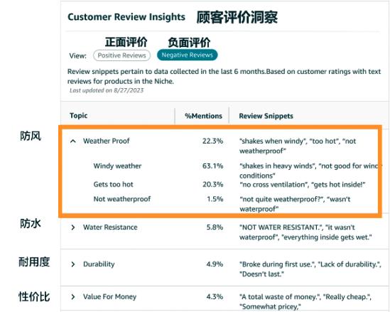 为此,该卖家顺着这一数据建议,全力优化帐篷的防风功能,扎扎实实地解决了顾客最大的痛点。