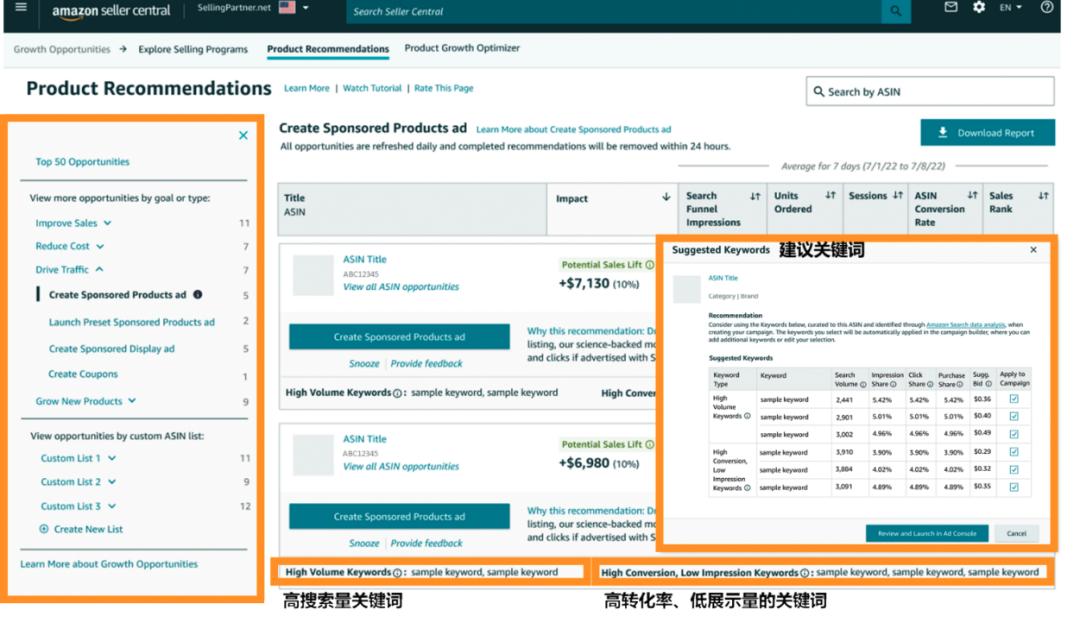 该功能打通了亚马逊品牌分析工具(ABA)的搜索分析数据,因此,其建议的关键词具有较大的参考性。