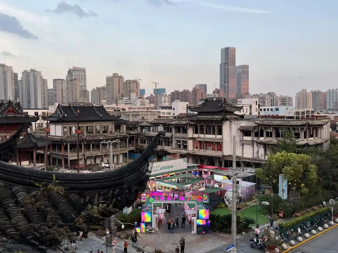 沿方浜中路到城隍庙门口,周围游客络绎不绝,民俗传统特色的灯光流光溢彩。大门正南面却是一整排尚未完工的仿古式建筑群,有的屋顶布满灰尘,窗户上的钢材还未拆除,院子里留着成堆的建筑垃圾,与周遭格格不入。