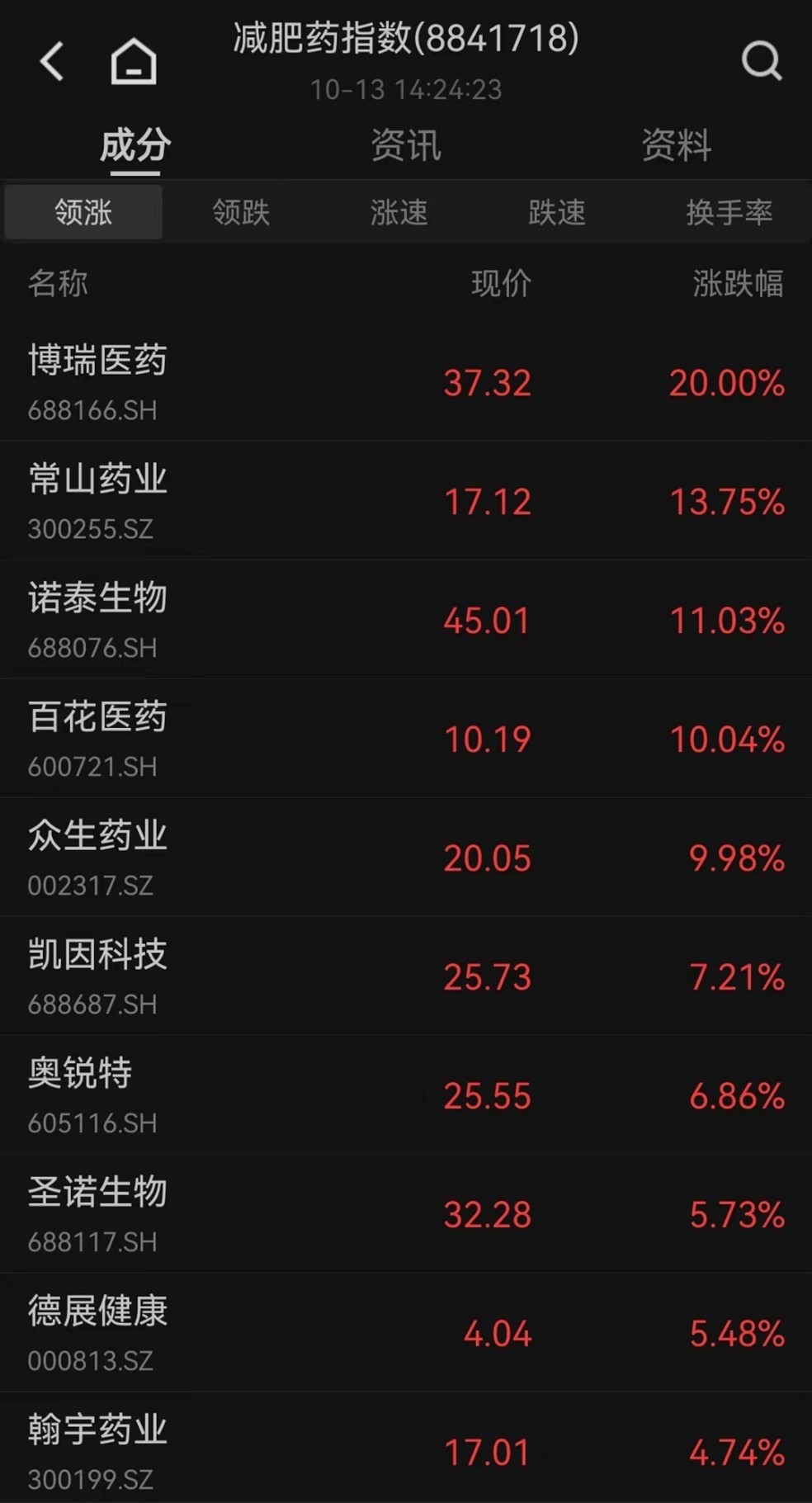 消息面上,隔夜美股减肥药概念股诺和诺德再创历史新高。此外,在10月12日公司投资者电话会议上,博瑞医药董事长表示,亲自试药后体重从91公斤降到76公斤。