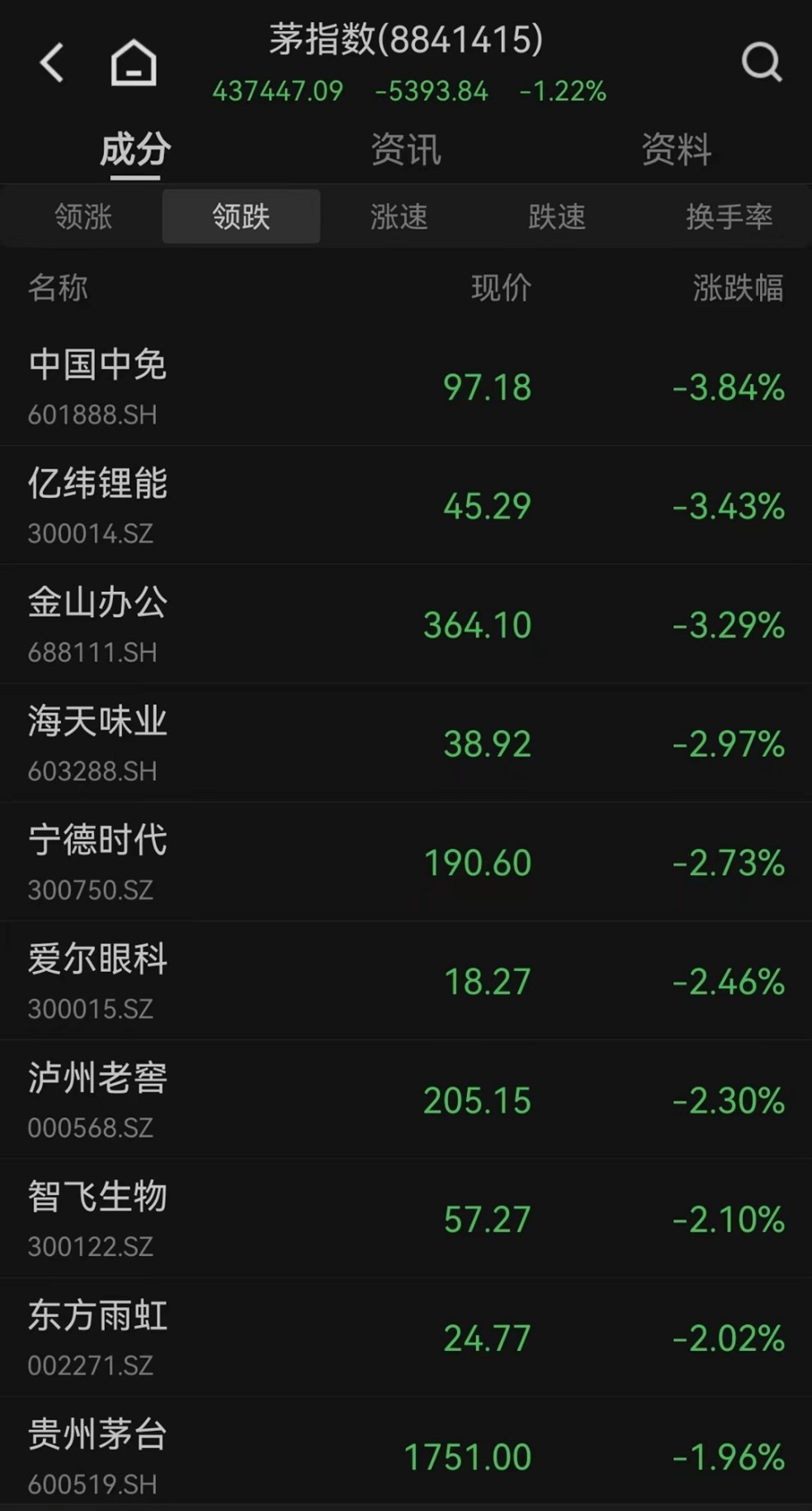 茅指数跌幅扩大至1%,新能源、大消费机构重仓股集体下挫,宁德时代跌超3%下破1900元关口,股价近2个月累跌超23%;阳光电源、北方华创、中国中免也均跌超3%,贵州茅台、隆基绿能、泸州老窖、海天味业明显走弱。