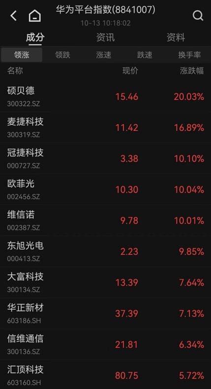 华为产业链持续活跃,欧菲光6连板,维信诺、东旭光电涨停,麦捷科技、东田微涨超15%,卓翼科技、荣联科技、格林精密等多股涨超5%。