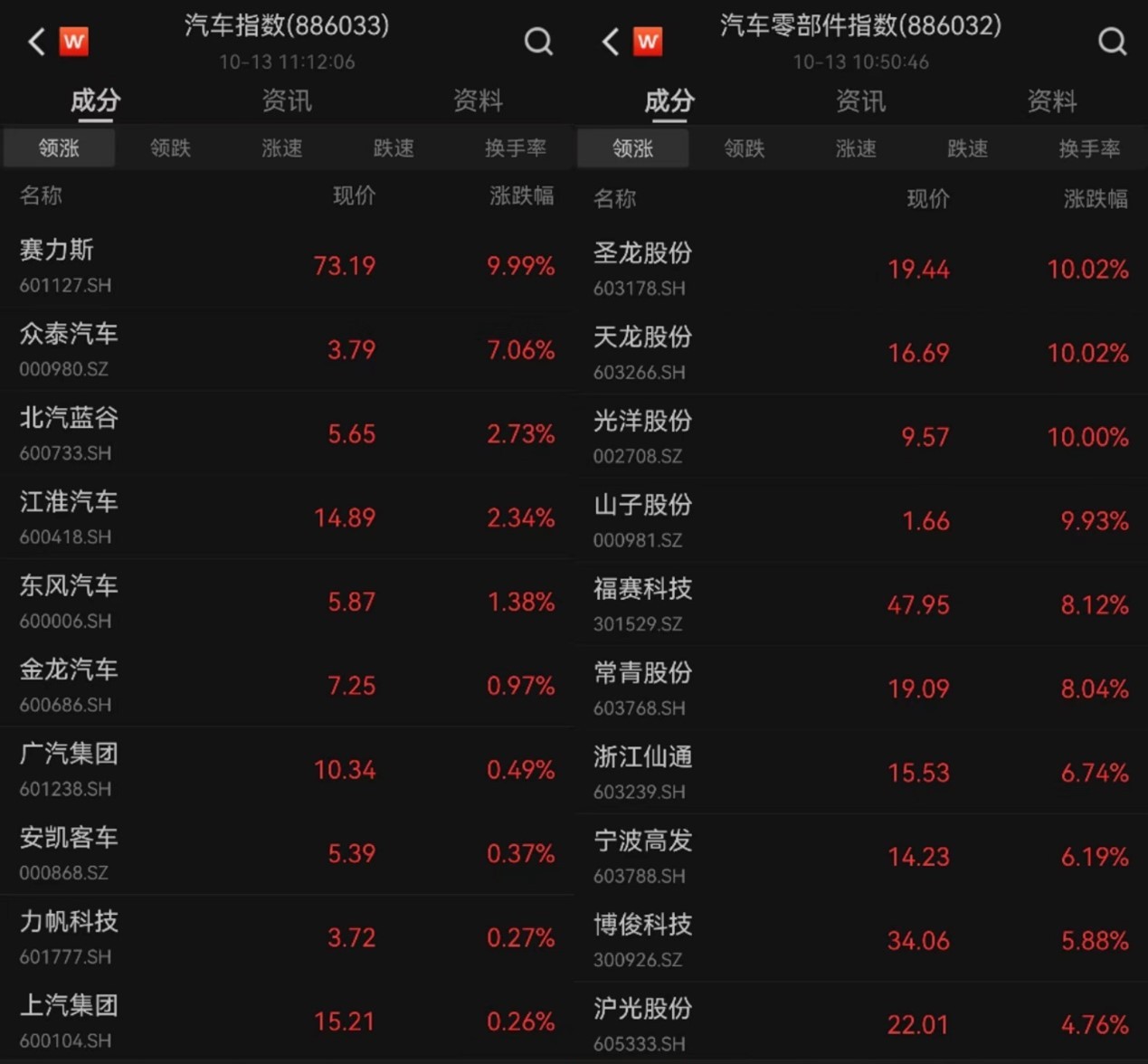 汽车产业链表现活跃,瑞鹄模具涨停创历史新高,天龙股份、圣龙股份、赛力斯涨停,众泰汽车、浙江仙通、宁波高发等多股涨超5%。