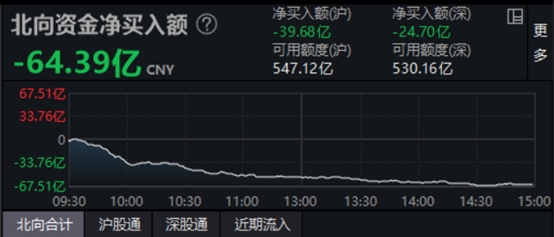今日收盘,A股三大指数集体下跌,沪指跌0.64%,深成指跌0.99%,创业板指跌1.11%;北向资金净流出64.39亿元。