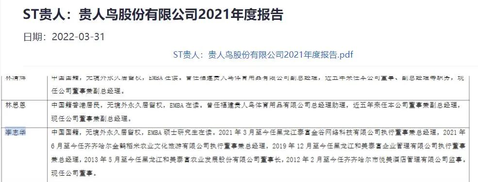富泰金谷重整完成后,贵人鸟进行了一系列人事变更。现在的贵人鸟,除李志华外,泰富金谷其他主要人员也成为了上市公司高管。