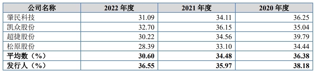 毛利率方面,2020年—2022年,捷众科技的综合毛利率分别为38.18%、35.97%、36.55%;同行业可比公司的毛利率平均数为36.38%、34.48%、30.60%。即便捷众科技近两年以来毛利率小幅度下滑,但均高于行业平均水平。
