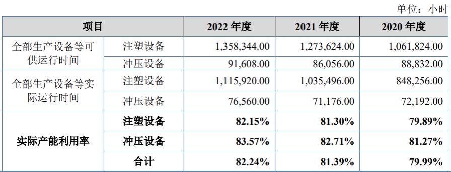 此外,在产能方面,2020年—2022年,捷众科技的注塑设备产能利用率分别为79.89%、81.30%、82.15%;冲压设备为81.27%、82.71%、83.57%。不难看出,公司的产量利用率仍具有较大的上升空间。