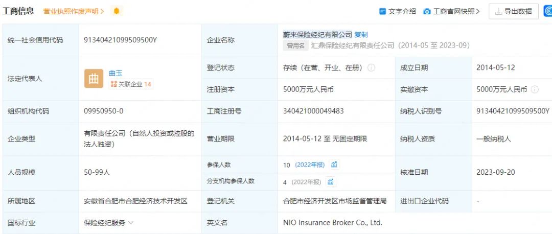 企查查显示,此次更名的汇鼎保险经纪成立于2014年,是一家以从事保险业为主的企业。2022年12月,汇鼎保险经纪被新进股东安徽蔚来数据科技全资收购,而后者由蔚来创始人、董事长李斌和蔚来联合创始人、总裁秦力洪共同出资成立,李斌为实际控制人。