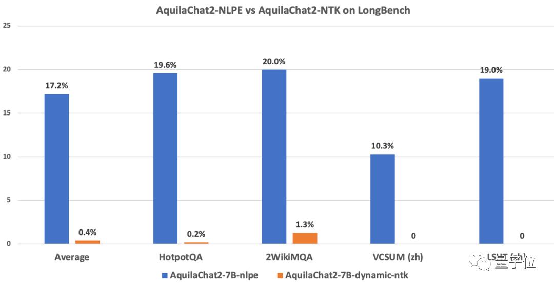 不仅如此,在长度为5K~15K的HotpotQA、2WikiMultihopQA等数据集上的指令跟随能力测试显示,经过 NLPE 外延的 AquilaChat2-7B(2K)准确率为 17.2%,而 Dynamic-NTK 外延的 AquilaChat2-7B 准确率仅为 0.4%。