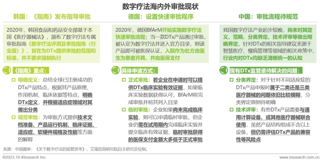 目前全球数字疗法发展仍处于初期阶段,全球大部分国家及地区对其定义和监管均较为模糊,尚未针对DTx建立专属审批制度,仅仅是把DTx作为数字医疗的一部分,使用数字医疗的监管制度。虽然DTx属于数字医疗范围下,但其许多性质特点是区分与数字医疗的,设置DTx专属审批流程规范迫在眉睫。放眼全球,真正为DTx审批落地设置专属政策的国家并不多,其中,韩国2020年发布的《数字疗法评测及审批指南(行业版)》为DTx审批提供了指导方向,同年德国BfArM开始实施DTx快速审批流程,并将其加入医保目录。相比韩国、德国等在审批制度上已有雏形的国家、或美国等在发展基础上相对成熟的国家,国内DTx行业起步较晚,不论是定义、范畴的界定,还是审批制度的明确都相对落后,仍需较长时间的探索。