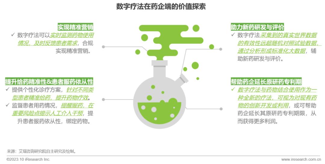 医药行业目前面临着处方外流导致分销渠道多元、销售策略待调整,药品集中采购、产品利润受挤压等挑战。随着数字疗法的发展,其在药企端的作用跟价值日益显现。数字疗法对于患者需求的及时反馈,可以帮助药企在合规情况下实现精准营销;其对患者健康数据的分析也可实现精准给药、提升药物疗效,同时软件设计可实现随时随地用药提醒,提升患者的服药依从性;另外,数字疗法与药品相结合的使用方式也可以帮助药企延长原研药获利周期,其采集的数据还可以应用于新药研发,实现多维度赋能药企。