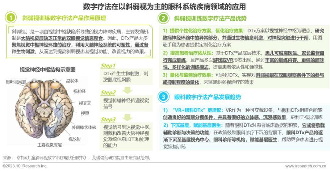 眼科数字疗法领域是国内发展较为成熟的细分赛道,截至2023年8月,我国已经批准了约22款眼科DTx产品,几乎占全部获批DTx产品的一半。目前国内的眼科DTx主要集中在儿童斜弱视和青少年近视防控两个领域,就斜弱视治疗而言,目前主流的方法是遮盖疗法,虽有一定疗效,但仍存在患者依从性差、治疗效果难维持、治疗周期长等痛点。近年来,聚焦视觉中枢神经、融合神经生物学等多学科技术的DTx产品不断涌现,它通过利用大脑神经系统的可塑性,将视觉训练与游戏、VR等形式结合,通过各种神经刺激,改善大脑神经视觉系统信息加工和处理的能力,改善或恢复患者的视觉功能。