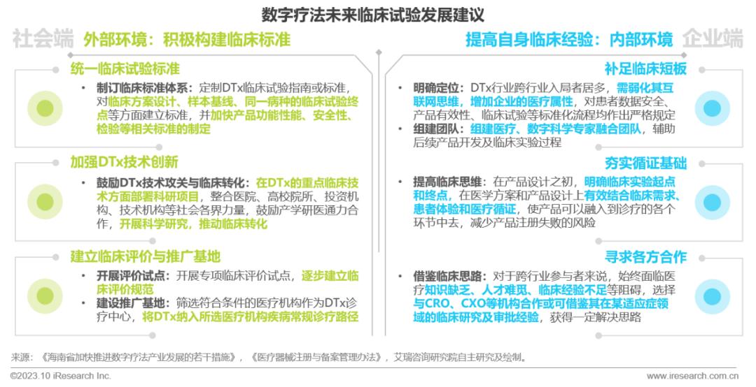 随着行业对数字疗法定义的理解越来越深,数字疗法是一种为患者提供基于循证医学证据的干预措施已逐渐得到普遍认同,临床实验作为数字疗法产品商业化的关键一环的重要性已得到广泛认可。为推动临床试验顺利进行,创造更多临床成果让DTx得到医生等专业主体的认可,有效推动其商业化进程,需从内外部环境同时着手。对内,企业应进行自我修炼,提高产品设计的临床思维,通过招募医疗人才、与CRO/CXO等公司合作补足其临床短板;对外,在政府的领导下,社会各界需共同努力,并借力地方政策优势,构建标准化临床试验,鼓励DTx企业联合各方创造更多临床成果,不断探索临床价值。