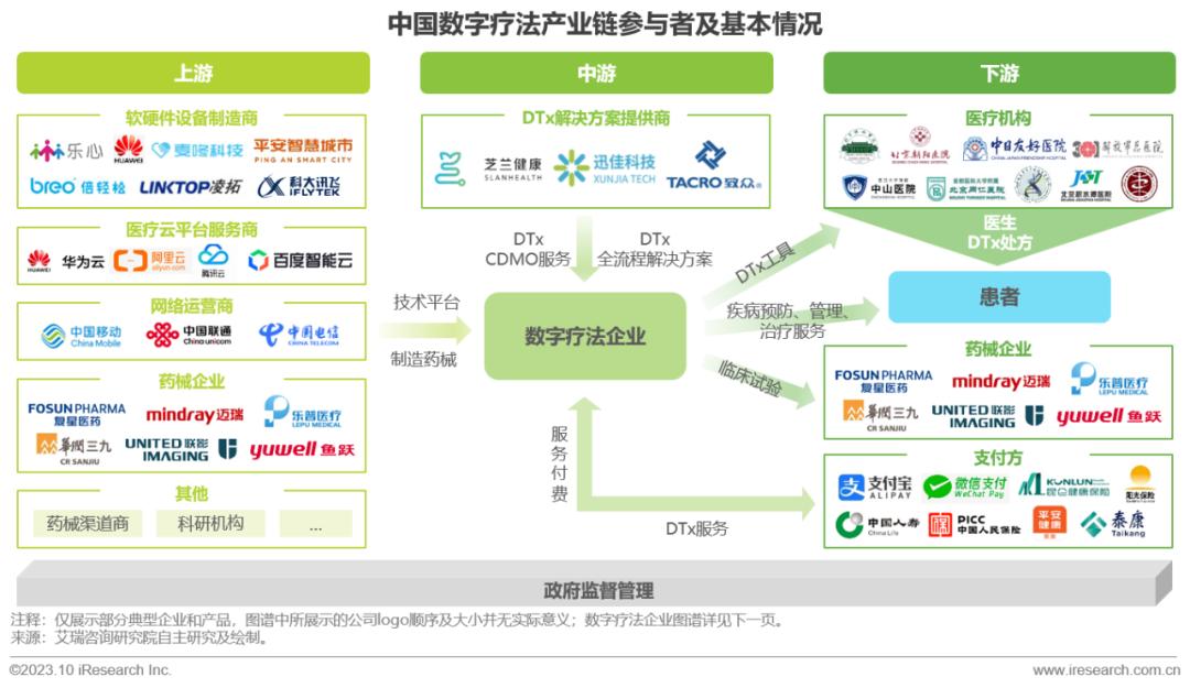 产业链上游的软件硬件设备制造商、医疗云平台服务商、药械厂商、网络运营商及科研机构等多方企机构为数字疗法企业提供技术平台、药械制造等服务;这些服务可直接触达DTx企业,也可通过DTx解决方案提供商进行资源整合,为DTx企业提供服务;产业链下游即用户,包括患者、医疗机构、医生、支付方、药械企业等主体。