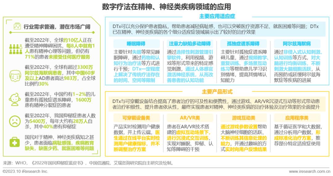 近年来中国精神、神经障碍康复需求人群不断扩大,但我国面临疾病教育缺失,多数患者病耻感较强,就医意愿不高的困境;反观医疗现状,由于脑部神经复杂,神经科学研究进展缓慢,面临着新药研发困难、药物安全性及有效性存疑等情况;同时,医护人员短缺等人才问题仍未解决,医患供需不平衡,就医困难,是传统疗法受限的典型领域。因此,将脑科学与数字技术相结合,运用DTx不断记录分析脑电信号、生理数据、以及行为数据等数据信息,对用户的健康状况做出准确评估,并将传统的治疗训练以游戏或沉浸式交互等形式展示给用户,在提升用户治疗体验的同时达到疾病改善的作用。