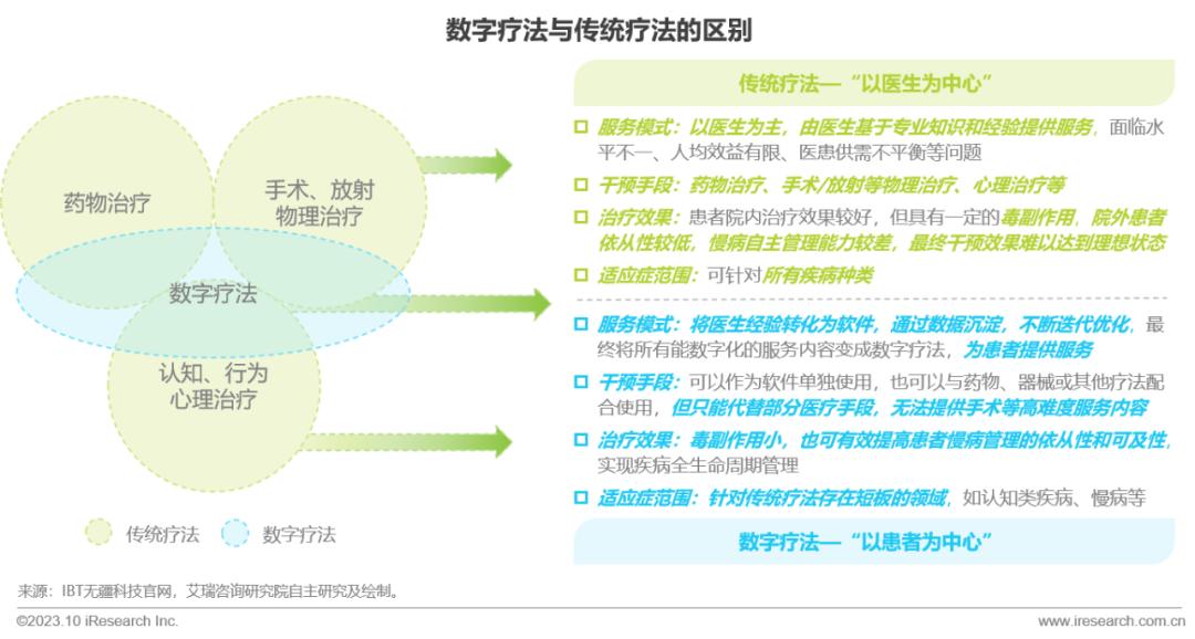 数字疗法与传统疗法之间最大的区别是服务主体的不同,传统疗法是以“医生为主,患者为辅”的医疗模式,而数字疗法将医生的经验和指导思想植入软件,研究如何为患者提供服务,服务主体实现从“医生”到“患者”的转变,重塑传统医疗的服务格局。此外,数字疗法在现有传统治疗手段的基础上,提供了一种全新的治疗方案,它并非独立于传统疗法而存在,而是针对传统疗法存在短板的区域,对其进行补充和优化;并通过数字产品的快速迭代,实现治疗方法的不断优化,使患者更早收益,配合传统医疗手段重塑未来疾病预防、诊断和管理全流程。