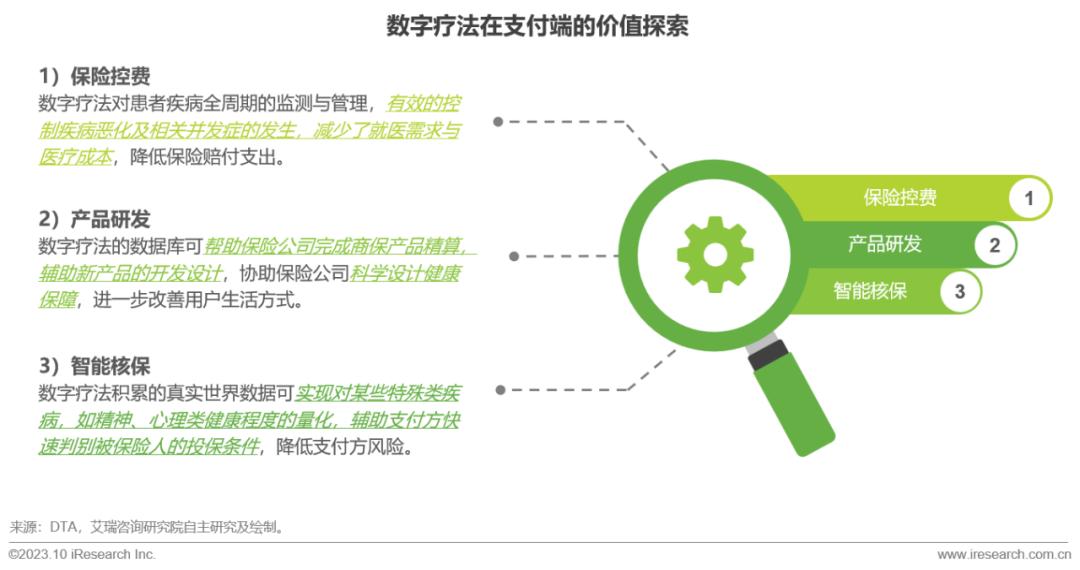 对于保险公司等支付方来说,数字疗法所积累的用户数据可以多维度帮助保险公司降本增效。首先,通过对数据的分析数字疗法软件能够更好的掌握患者的健康、疾病信息,提醒患者进行疾病管理,有效的控制病情恶化从而帮助保险公司降低赔付支出;其次,这些数据还可以被用于保险产品的开发设计中,协助保险公司设计出可以进一步改善群众健康生活方式的保险产品,并实现智能核保,最后在惠及大众的基础上降低赔付风险,帮助支付方获益。