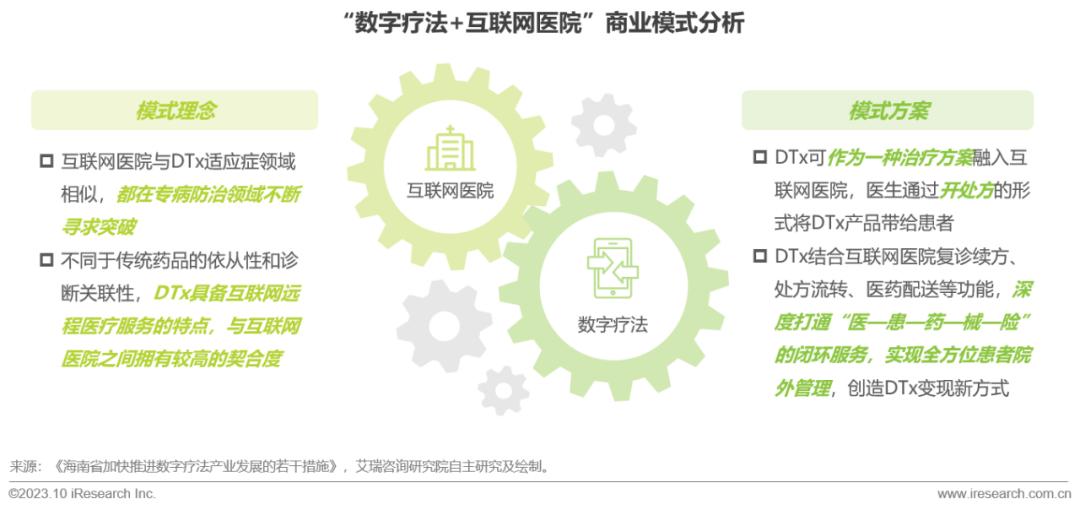 DTx作为一种治疗方案,难以独立于医生而存在,推动DTx从院端准入,作为医生工具发挥其价值或为目前较理想的商业方案。目前国内DTx公司大多利用现有资源推动与院端的合作,通常面临资源不足、监管严格、准入困难等问题;随着互联网医院的蓬勃发展,其远程医疗服务模式与DTx达成了天然一致,辅之以对慢病管理领域的深耕经验,或可成为DTx企业寻求商业变现的新方向。以海南省为首的省份占领先机,印发的《海南省加快推进数字疗法产业发展的若干措施》政策强调,“应推动互联网医院与DTx产品融合发展,提升在专病防治和健康干预等领域的服务功能,鼓励医疗机构将DTx与互联网医院平台整合,赋予医生在互联网医院开具DTx处方的权限”。目前已有部分DTx企业在申请数字疗法资质的同时申请互联网医院牌照;未来,“数字疗法+互联网医院”的商业模式或为商业破局提供新思路。