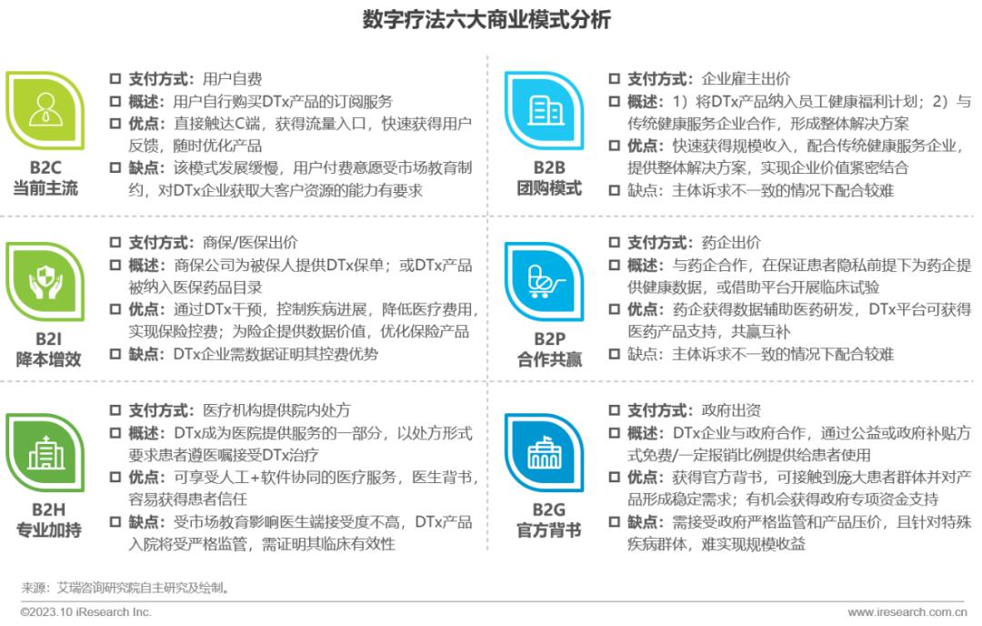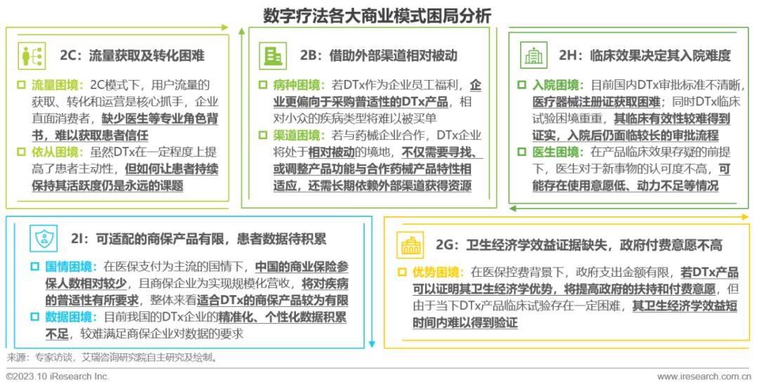 数字疗法产品在通过临床试验之后,对于企业来说,如何推动产品落地,实现其商业价值就成为下个阶段的核心重点。目前现存的几种商业模式都遭遇了不同的难题,目前DTx企业处于相对被动的合作境地,2C模式下较容易受到流量获取及患者依从性影响从而推广困难,2I模式受到国内商保国情影响或较难大规模推广,2B模式下较容易受到合作企业客观条件制约,2G模式下受到政府卫生经济学效益的考验。艾瑞认为,由于DTx产品区别于其他健康管理产品的核心价值是“以循证医学为基础”,因此加快DTx临床试验、证明产品有效性及安全性,将商业化重心移至院端,让DTx产品作为医生提供医疗服务的一种手段,获得医生的接受和认可,或许可以帮助DTx企业在市场上增强说服力,转被动为主动,吸引更多商业合作。