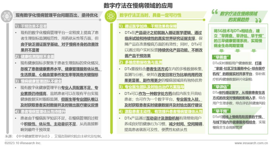 传统医疗手段存在短板的另一典型领域是以代谢性疾病、心血管疾病、癌症、慢性呼吸系统疾病为代表的慢性疾病。这类疾病通常存在无特效药、难以治愈的特点,患者需要从饮食、运动等日常生活方式着手,进行长期、连续的自我健康管理来改善疾病。DTx可通过鼓励患者坚持特定饮食和运动等方式,改变患者日常生活行为;也可与5G技术、可穿戴设备、物联网设备相结合,方便患者随时随地完成健康检测,实时传输数据,利用核心算法为患者提供基于循证医学的干预措施,医护人员也可及时获取健康数据、并提供个性化的健康管理计划。