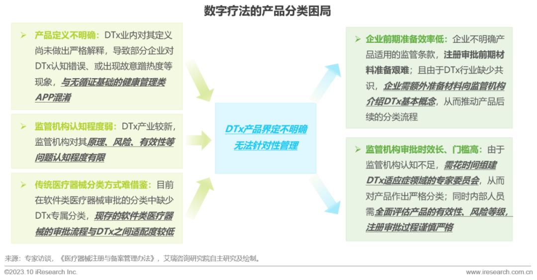 国内数字疗法产业处于发展初期,发展速度较快,且面临产业先行、规模化市场未形成、市场监管规定不明确等问题。当一个新的医疗产业出现的时候,监管机构希望能够对医疗器械的安全性和有效性做出保障,但由于数字疗法属于创新型行业,目前不论对于临床、行业还是监管机构来说,均对数字疗法的理解存在较大偏差,定义与标准尚不明确,监管机构难以识别其有效性及风险性质,信息标准化水平制约着监管规范的确定。此外,传统医疗器械分类政策与DTx不适配,进一步导致监管机构对数字疗法产品的分类界定标准模糊,审批规范不明确。这些问题的出现使得数字疗法产品审批困难,也耽误了企业产品的市场化进程。