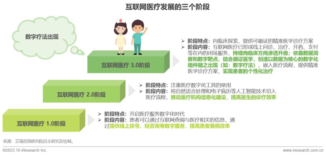 互联网医疗的发展目前经历了三个阶段。1.0阶段从患者端入手,提供预约挂号、咨询问诊、移动支付等不涉及具体诊疗的外围医疗服务,解决了患者最简单的医疗需求,优化了医疗服务的流程,连接了大规模患者,聚合了大量的医疗资源,但这这一阶段并没有创造新的服务供给,未能解决有限的医疗服务资源供给与优质医疗服务之间的供需矛盾。2.0阶段,医疗回归到医生本身,开始注重数字化医疗工具的使用,优化医疗资源,通过智能分诊服务、电子病历等ai系统提高了医生的诊疗效率,弱化了医疗服务的供需矛盾。互联网医疗发展到3.0阶段,持续向临床方向渗透升级,专注于将以数据为核心、循证医学为基础的数字化组件切入到医疗流程中,“数字疗法”作为该阶段出现的、具有代表性的可循证数字化软件,将在进一步解决医疗供需矛盾的基础上,更加专注于患者,为患者提供精准化、个性化的诊疗方案。