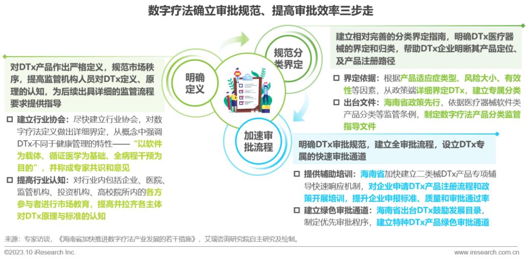 明确数字疗法定义,严格区分数字疗法与其他健康管理软件是规范行业发展的基础,因此,明确数字疗法的审批规范的第一步应该从概念着手,尽快建立行业协会,根据产品特点作出严格定义。在概念达成一致的基础上,建立完善的数字疗法产品分类界定指南,明确审批规范,同时不断细化审批内容,构建数字疗法全审批流程,帮助企业快速找准产品注册路径,加快商业化脚步。在以政府为首的行业各主体共同努力推动审批规范明确的背景下,以海南省为例的地方政府加快行业探索步伐,推出全周期数字疗法产业支持政策,对数字疗法产品分类监管及注册审批给予明确指导,并建立优先审批通道,对一批循证依据坚实、技术成熟度高、省内临床急需、发展前景广阔的数字疗法产品采取鼓励发展措施,全面加速数字疗法产品的注册审批效率。