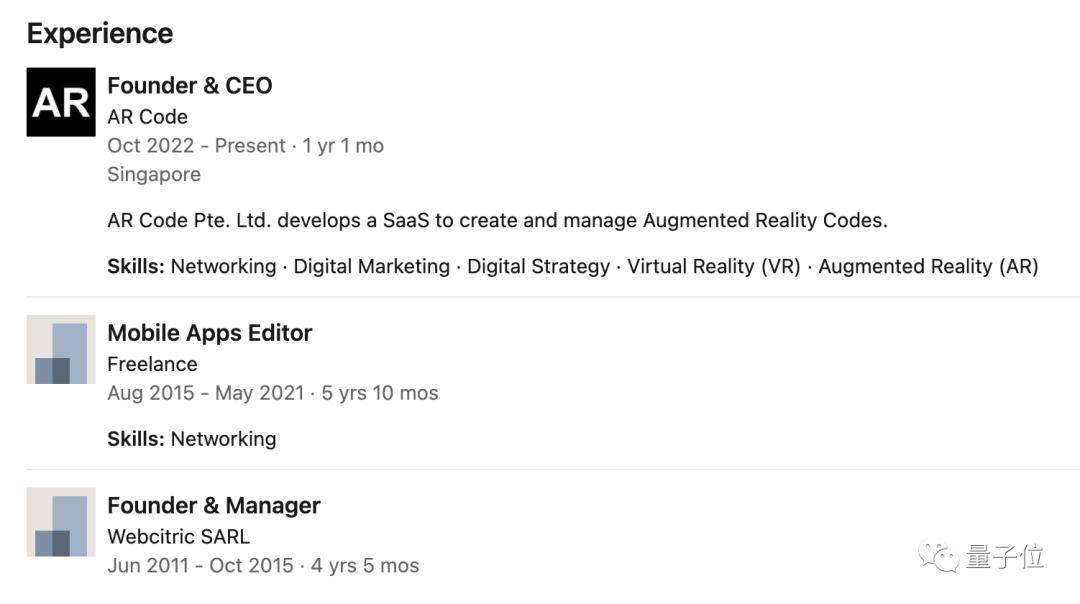 在此之前,他也创立经营过Webcitric,而后做了近6年的自由职业;最终于2022年10月成立了AR Code。
