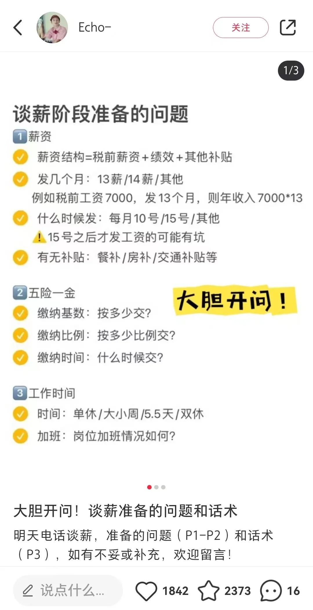 见惯了互联网上的劳动纠纷,年轻人早早学会了多留个心眼。在社交平台上,不乏博主教大学生谈薪技巧,列出一长串详细的问题清单。