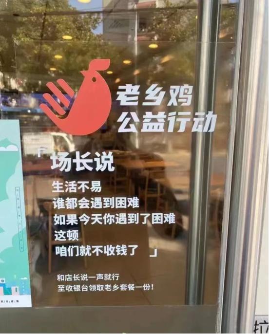 此外值得关注的是,老乡鸡常年来推出“爱心一餐”行动,全国1000多家门店始终为困难人士提供免费套餐。
