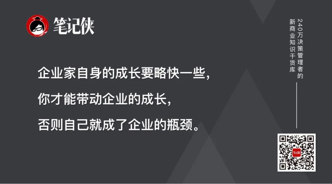 甚至很多时候,企业家自身的成长还要略快一些,你才能带动企业的成长,否则自己就成了企业的瓶颈。