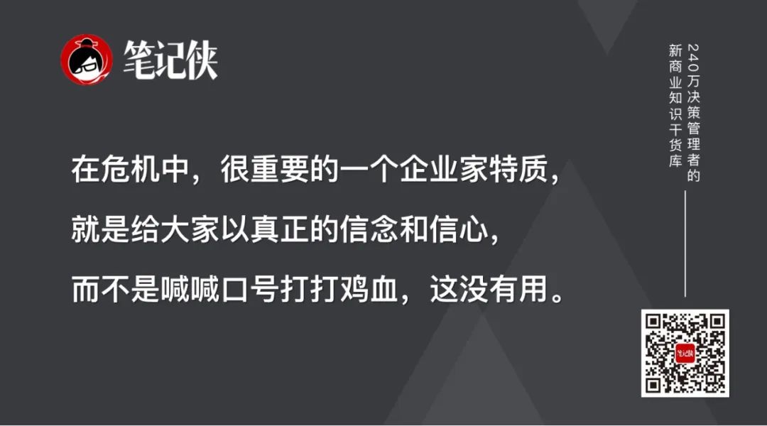 在危机中,我觉得很重要的一个企业家特质,就是给大家以真正的信念和信心,而不是喊喊口号打打鸡血,这没有用。