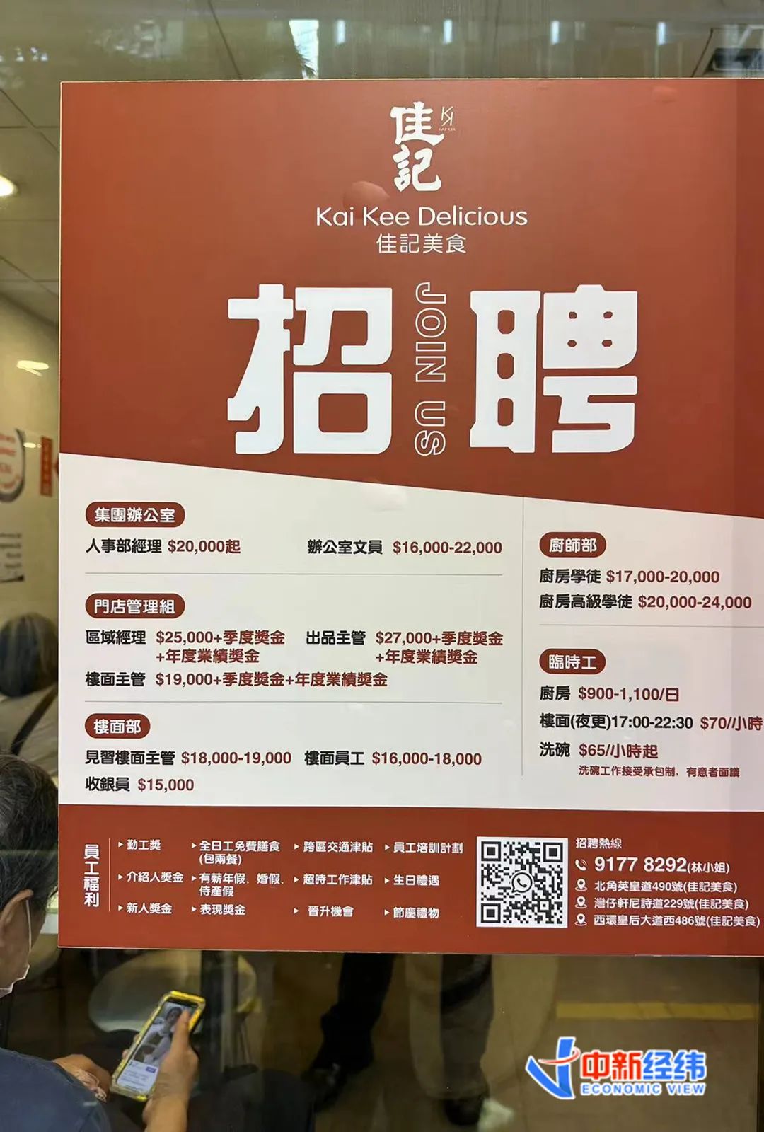 中新经纬近期在位于香港岛湾仔轩尼诗道的佳记美食的招聘启事上看到,该餐厅招聘厨房学徒的月薪为17000-20000港元(约15878-18680元),厨房高级学徒可达24000港元(约22416元),区域经理为25000港元(约23350元),另加季度奖金和年度业绩奖金。根据openrice平台,佳记美食的人均消费在50港元(约47元)以下。