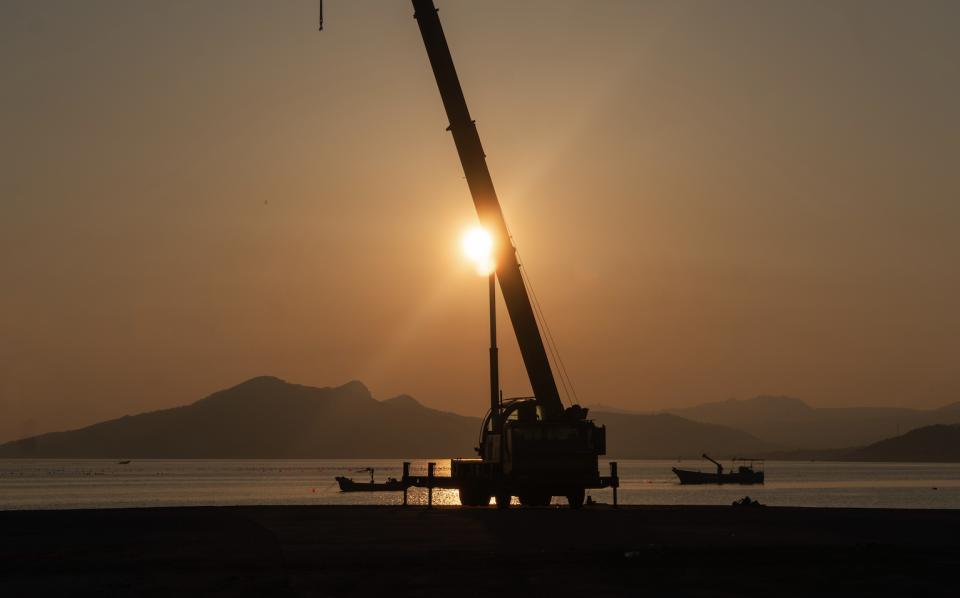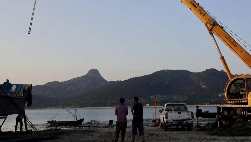 小岛四周的海域里,目之所及,皆是红色或蓝色的浮漂,把海面映得格外鲜亮,在看不见的海面下,每一个浮漂都吊着一笼生蚝,这是小青岛村赖以生存的产业。码头上,也布满了收获生蚝的起重吊机。