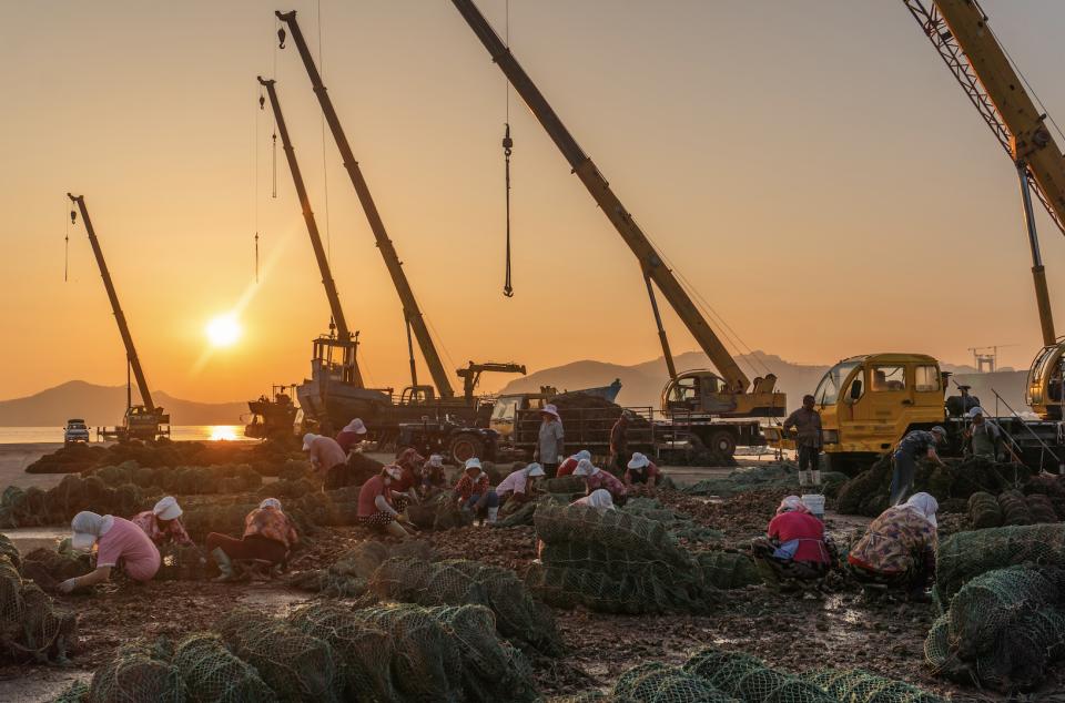 傍晚时分,走近码头,耳边即被“叮叮当当”声填满。9月,渐渐长大的生蚝把笼子占满,为了保证继续生长的空间,工人们将生蚝捞出、分离,分成两笼,这一工序叫“分笼”。二十余个老人蹲坐在码头上,不断地敲击着、分拣着生蚝。“十几年来都是干这个活,一个小时20多元,一个月能挣三四千元。”60岁的村民郑阿姨笑着说。