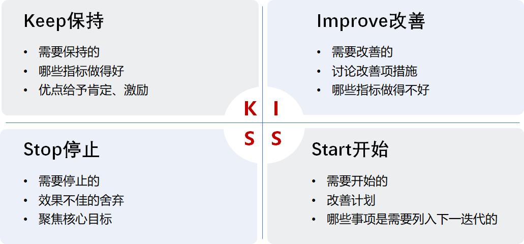 KISS是一种科学的项目复盘方法,用于促进下一次活动更好的展开,常被应用于活动策划落地执行或者项目执行结束后总结使用。