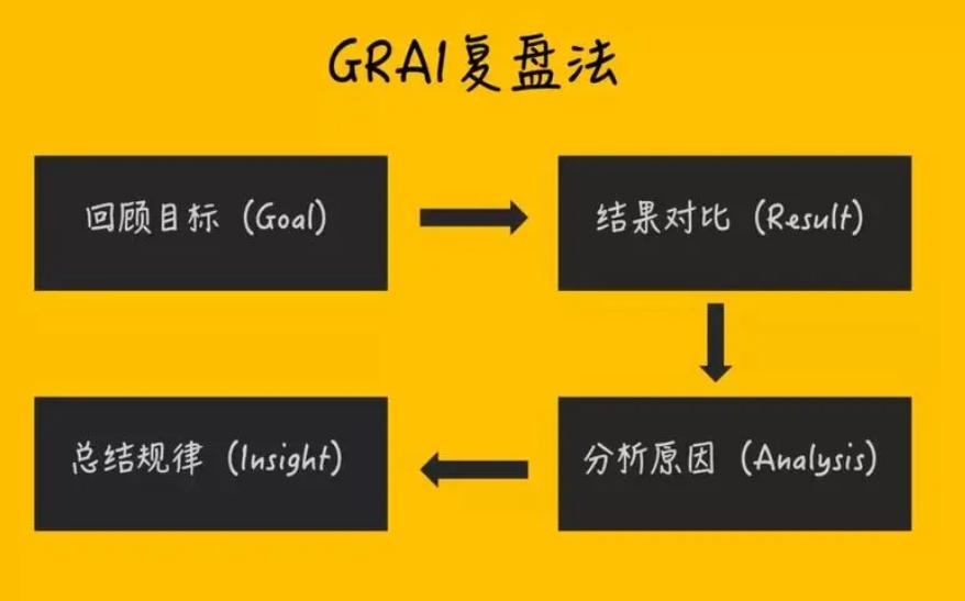 GRAI复盘法是一种常见的复盘方法,GRAI分别指的是:G(Goal,回顾目标)、R(Result,评估结果)、A(Analysis,分析原因)、I(Insight,总结经验)。