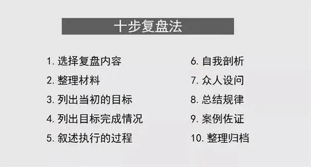 相比较GRAI复盘法和KISS复盘法,十步复盘法要更加全面。当然,这种方法需要花费的时间也比较多,因此通常适用于年终总结或大型项目结束后。