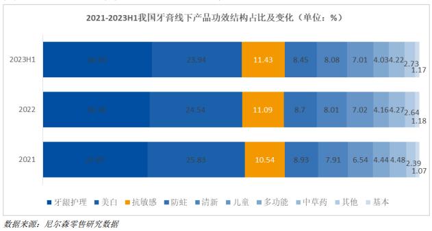 根据尼尔森零售研究数据,在产品功效上,牙龈护理、美白和抗敏感类牙膏仍是消费者购买的主要品类,2023 年上半年线下市场份额占比分别为28.93%、23.94%和 11.43%。美白这类常规功效的牙膏市场份额持续萎缩,牙龈护理和抗敏感等强功效品类持续提升,且抗敏感牙膏线下市场份额增速较快。