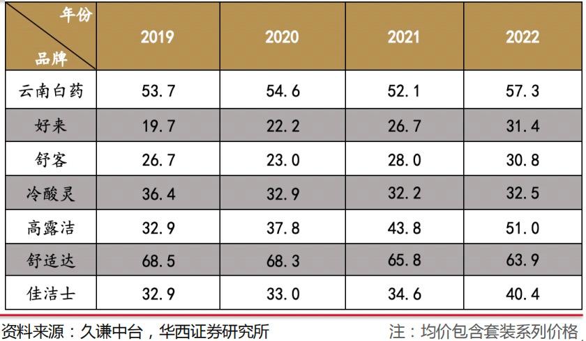 牙膏均价的上升几乎成了行业共识。综合线上天猫平台各品牌2019年-2022年均价来看,云南白药、好来、舒客、高露洁、佳洁士的产品均价均有所上涨,其中,高露洁更是从2019年的32.9元上升至2022年的51亿元,上升了51.98%。
