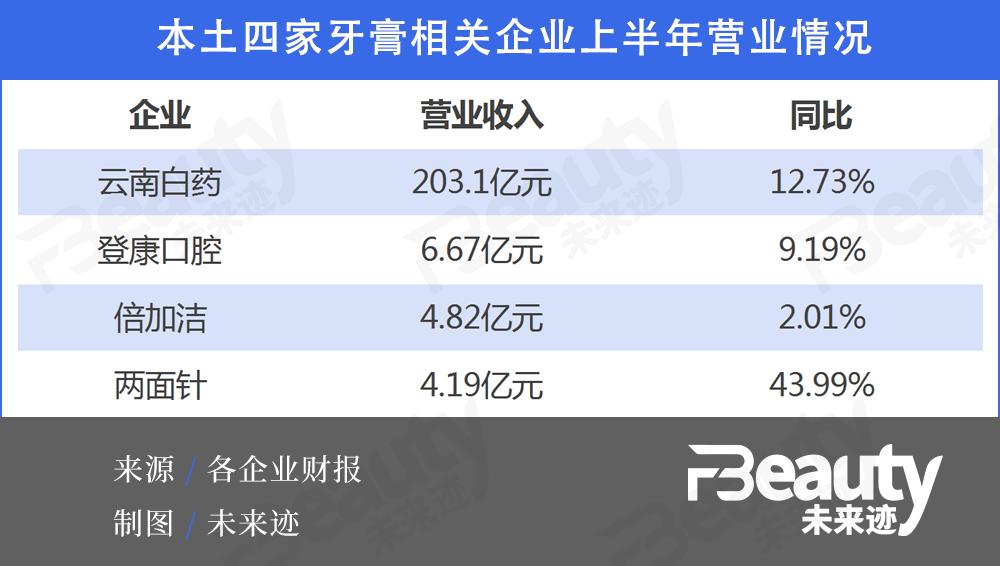 根据云南白药、登康口腔、倍加洁、两面针发布的上半年财报,其均取得一定程度的增长,其中,云南白药以总营业收入203.1亿元,牙膏业务所在健康品事业部实现主营业务收入32.45亿元,断崖式稳坐本土牙膏第一企业。