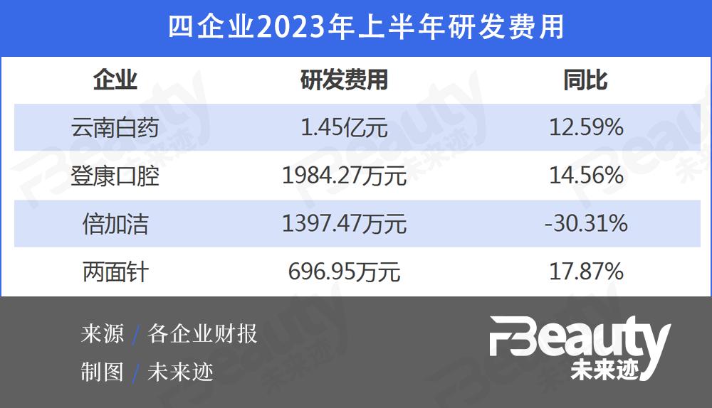 强功效需求的驱动下,各企业正在不断加码科研。综合4企业2023年上半年研发费用情况来看,除开倍加洁,其余企业的研发费用同比都呈上升趋势。对于研发费用的降低,倍加洁在财报中指出,主要受到研发项目投入材料的比例减少影响。