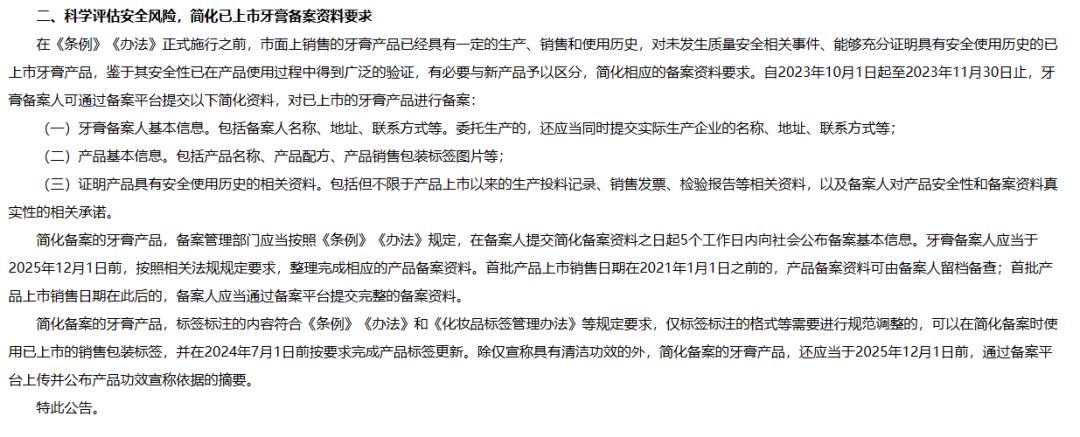 也就是说,已上市牙膏备案资料要求得到“松绑”。在简化已上市牙膏备案资料要求上,《公告》指出,自2023年10月1日起至2023年11月30日止,牙膏备案人可通过备案平台提交三项简化资料,对已上市的牙膏产品进行备案。一是牙膏备案人基本信息;二是产品基本信息;三是证明产品具有安全使用历史的相关资料。
