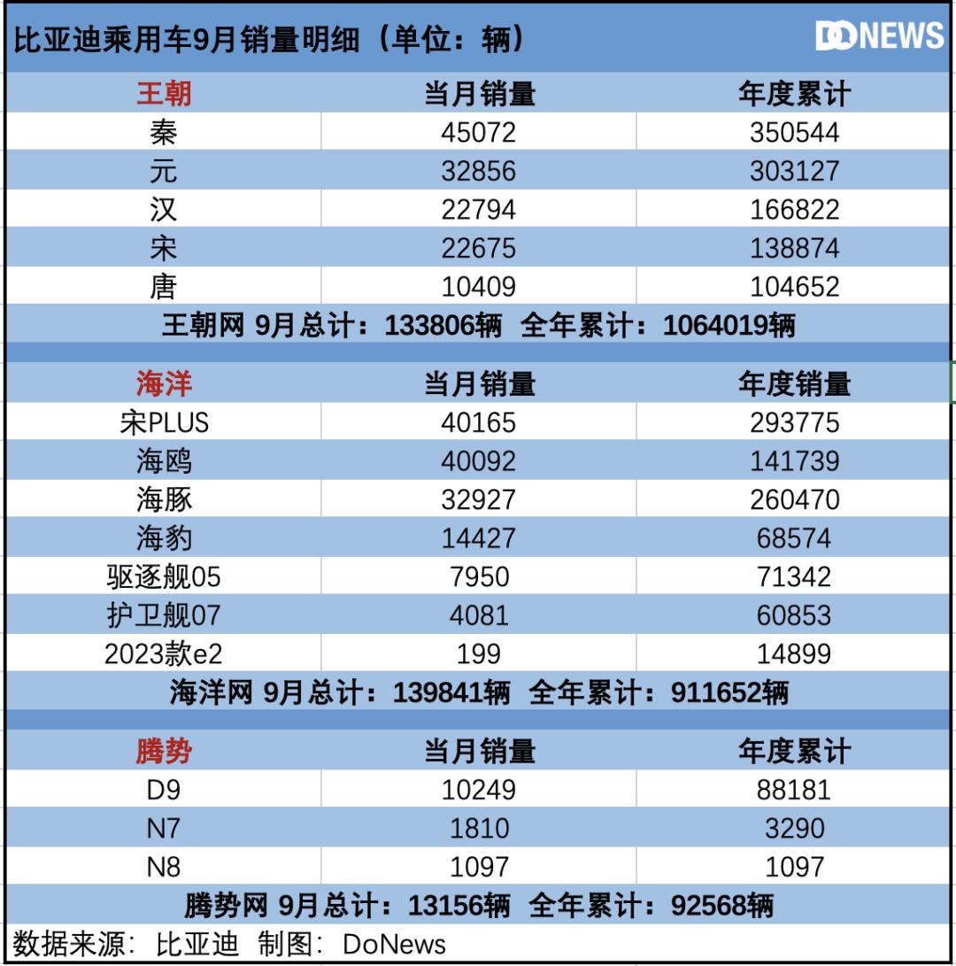 具体来看,9月比亚迪王朝网销售133806辆,同比增长9.1%,五款车型销量均破万辆;海洋网销售139841辆,海鸥销量突破4万辆;腾势汽车销量为13156辆,D9销量过万。