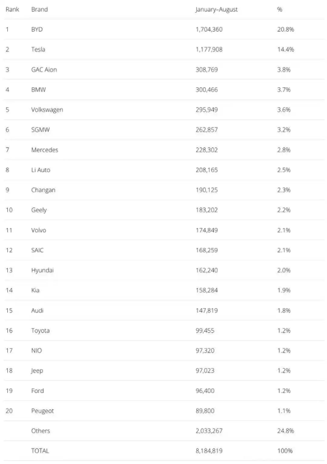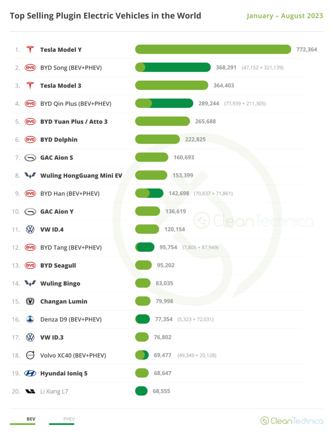 几天前, CleanTechnica 公布了今年1-8月的全球新能源乘用车销量数据,不出意外的是,比亚迪和特斯拉的销量遥遥领先,比亚迪取得了超过170万辆的销量,不过其中包括了插电式混合动力(PHEV)车型,紧随其后的是特斯拉,接近118万辆,纯电动(BEV)车型销量则超过比亚迪。