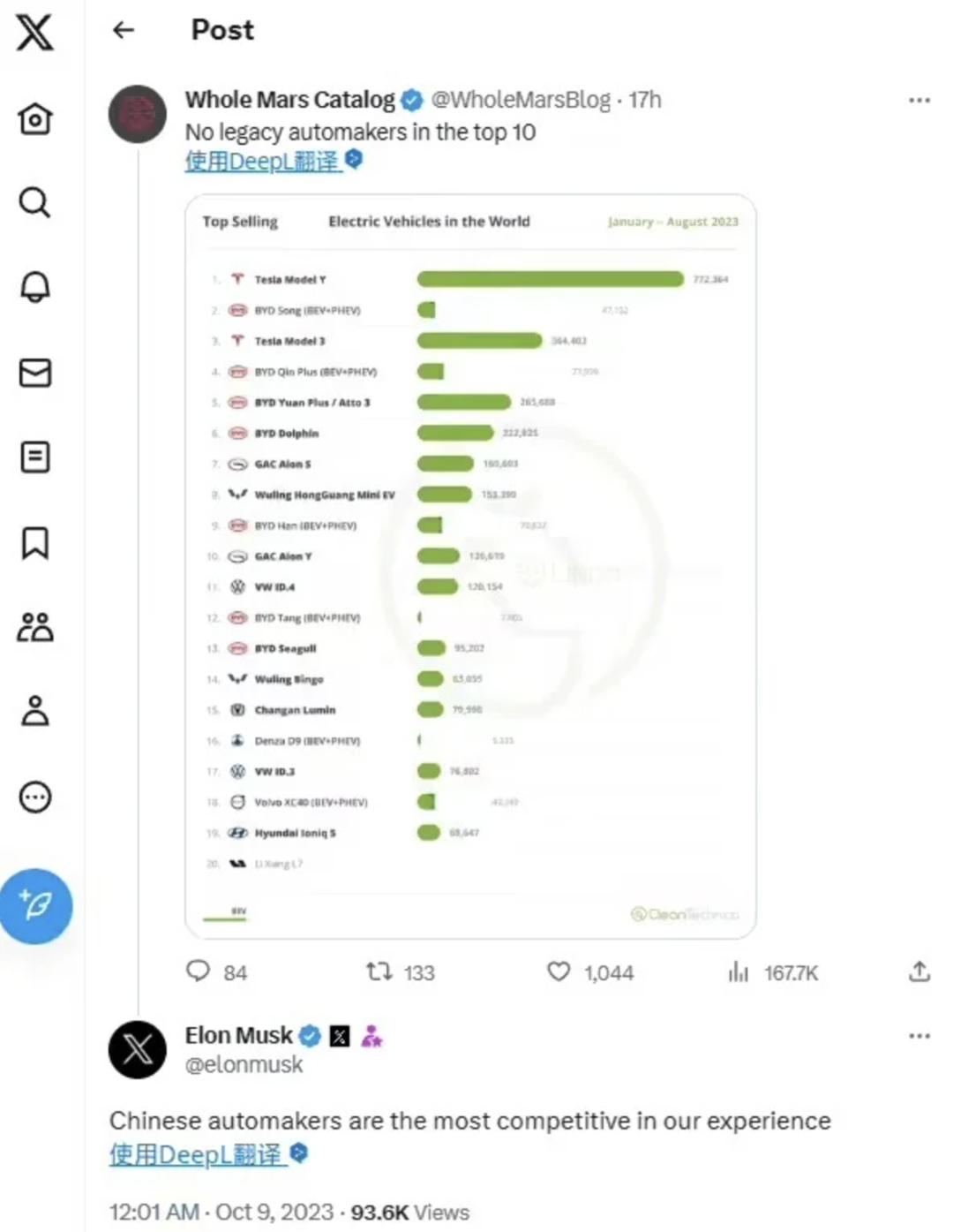 今年前8个月,表现最亮眼的电动车创业公司莫过于理想汽车,月销量屡创新高,而广汽埃安是最接近比亚迪和特斯拉的电动车品牌——这两家公司都来自中国,比起“新”、“传统”的区别,可能地域的标签更重要。马斯克在科技博主 Whole Mars Catalog 的推文中回复称:“根据我们的经验,中国车企最具竞争力。”