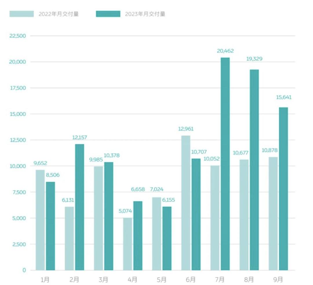 蔚来曾表示:“不会参与价格战的,蔚来的定价追求一步到位。”但蔚来还是受到了“降价潮”带来的冲击,6月12日,蔚来在官方公众号宣布,全系车型起售价减3万元,也带来了销量的一段猛增。9月蔚来汽的交付量是15641辆,同比增长43.8%,相较于理想汽车的成绩多少有点不够看,不过跟过去相比已经是不错了。